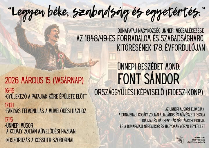 Dunapataj Nagyközség Önkormányzata ünnepi megemlékezést szervez az 1848–49-es forradalom és szabadságharc kitörésének 178. évfordulója alkalmából. A program március 15-én, vasárnap este várja a település lakóit közös emlékezésre.