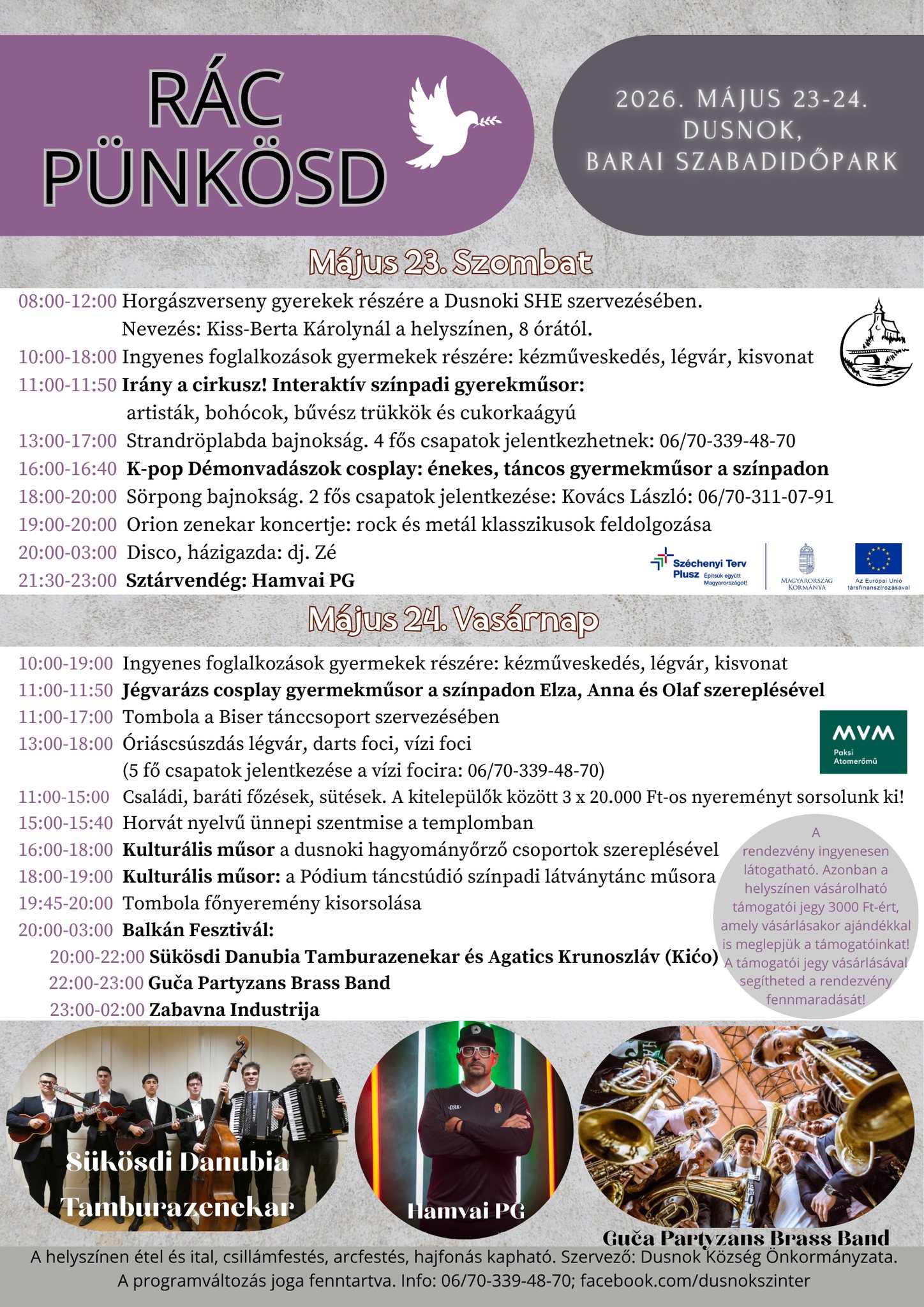 Színes kulturális és szórakoztató programokkal rendezik meg idén is a Rác Pünkösdöt Dusnokon. A kétnapos rendezvénynek 2026. május 23–24-én a Barai Szabadidőpark ad otthont, ahol a szervezők koncertekkel, családi programokkal, versenyekkel és hagyományőrző műsorokkal várják az érdeklődőket.Színes kulturális és szórakoztató programokkal rendezik meg idén is a Rác Pünkösdöt Dusnokon. A kétnapos rendezvénynek 2026. május 23–24-én a Barai Szabadidőpark ad otthont, ahol a szervezők koncertekkel, családi programokkal, versenyekkel és hagyományőrző műsorokkal várják az érdeklődőket.