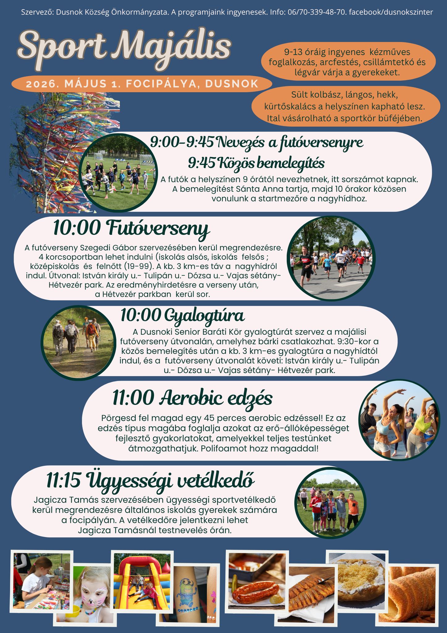 Sporttal, közösségi programokkal és családi kikapcsolódással várják az érdeklődőket Dusnokon május 1-én. A település focipályáján megrendezett Sport Majálison futóverseny, gyalogtúra, aerobic edzés és gyermekprogramok is színesítik a napot.
